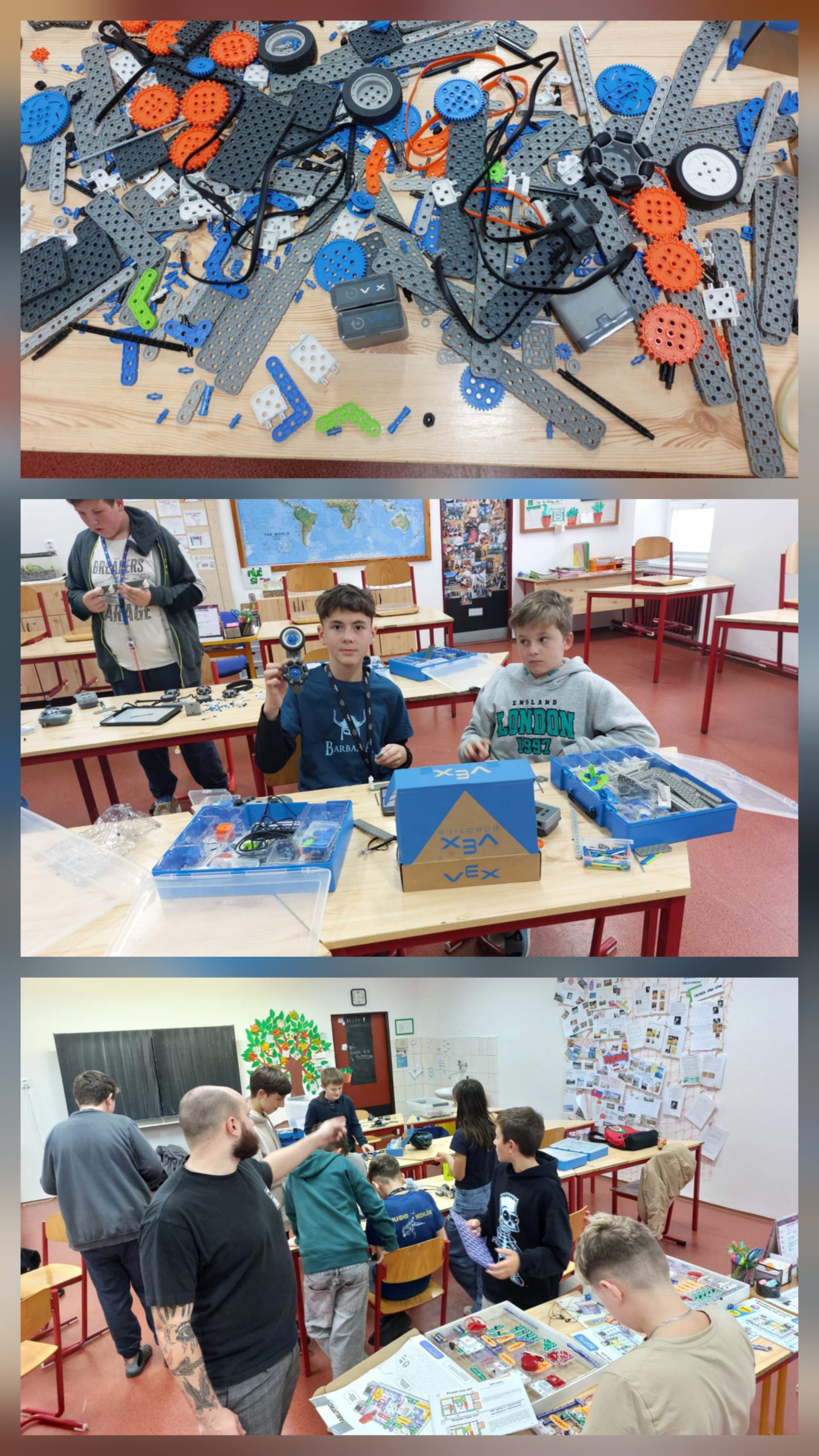 Náš školní kroužek robotiky a elektrotechniky letos zaznamenal nebývalý zájem ze strany žáků. Přihlásilo se tolik dětí, že jsme museli rozšířit tým na dva zkušené lektory, kteří se dětem věnují s nadšením a odborností. Matěj, který vedl kroužek v předchozích letech, se nyní připravuje na maturitu a přijímací zkoušky na vysokou školu. Proto jej ochotně zastoupil další náš bývalý žák Alex, kterého doplnil zkušený dospělák Jirka, který v elektro oboru pracuje. Díky tomu se mohou děti učit v menších skupinkách, což zajišťuje individuální přístup a kvalitní vedení při práci na projektech. K dispozici mají robotické stavebnice VEX, které umožňují stavbu a programování funkčních robotů. Dále elektrotechnickou stavebnici Boffin, s níž si děti osvojí základy elektroniky hravou formou. V neposlední řadě také VR brýle, které otevírají dveře do světa virtuální reality a rozšiřují možnosti interaktivního učení. Kroužek je ideální pro všechny zvídavé děti, které chtějí poznat, jak fungují moderní technologie, naučit se základy programování, elektrotechniky a rozvíjet kreativitu i týmovou spolupráci.
