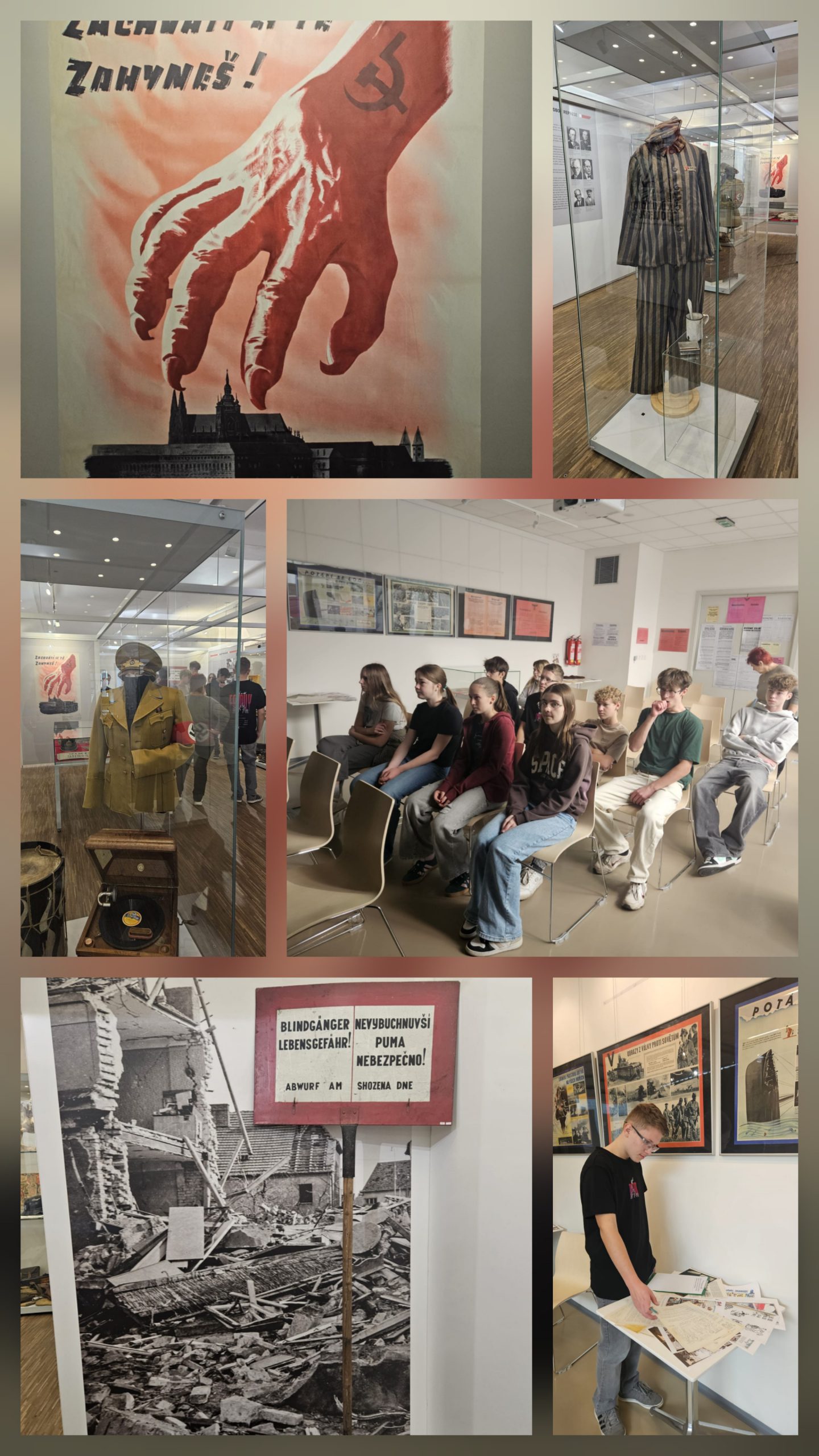 V rámci výuky dějepisu se žáci 9. ročníku vydali 31. 10. 2025 do muzea v Kolíně na výukový program „Kolín ve stínu smrtihlava“. Jeho součástí byla výstava mapující období od září 1938 do konce 2. světové války. Zajímavé byly vystavené osobní předměty lidí žijících v této době, vyhlášky upravující život v Protektorátu Čechy a Morava, fotografie dokumentující život v Kolíně během války. Pan průvodce vysvětloval, jak všechno fungovalo, jak obyčejné lidi poznamenala německá okupace, jak vypadal Kolín po spojeneckých náletech včetně ukázky bomb, které na město dopadaly. Pak se nám věnovala paní lektorka. Měla připravené dobové tiskoviny – vyhlášky, časopisy, přídělové lístky na potraviny, oblečení, obuv, tabák, atd. Na základě prezentace jsme měli za úkol najít odpovědi na otázky týkající se života kolínských občanů v době války. Získali jsme hodně informací a celou řadu zajímavostí. Program byl zajímavý a poznatky využijeme v dalších hodinách dějepisu.
