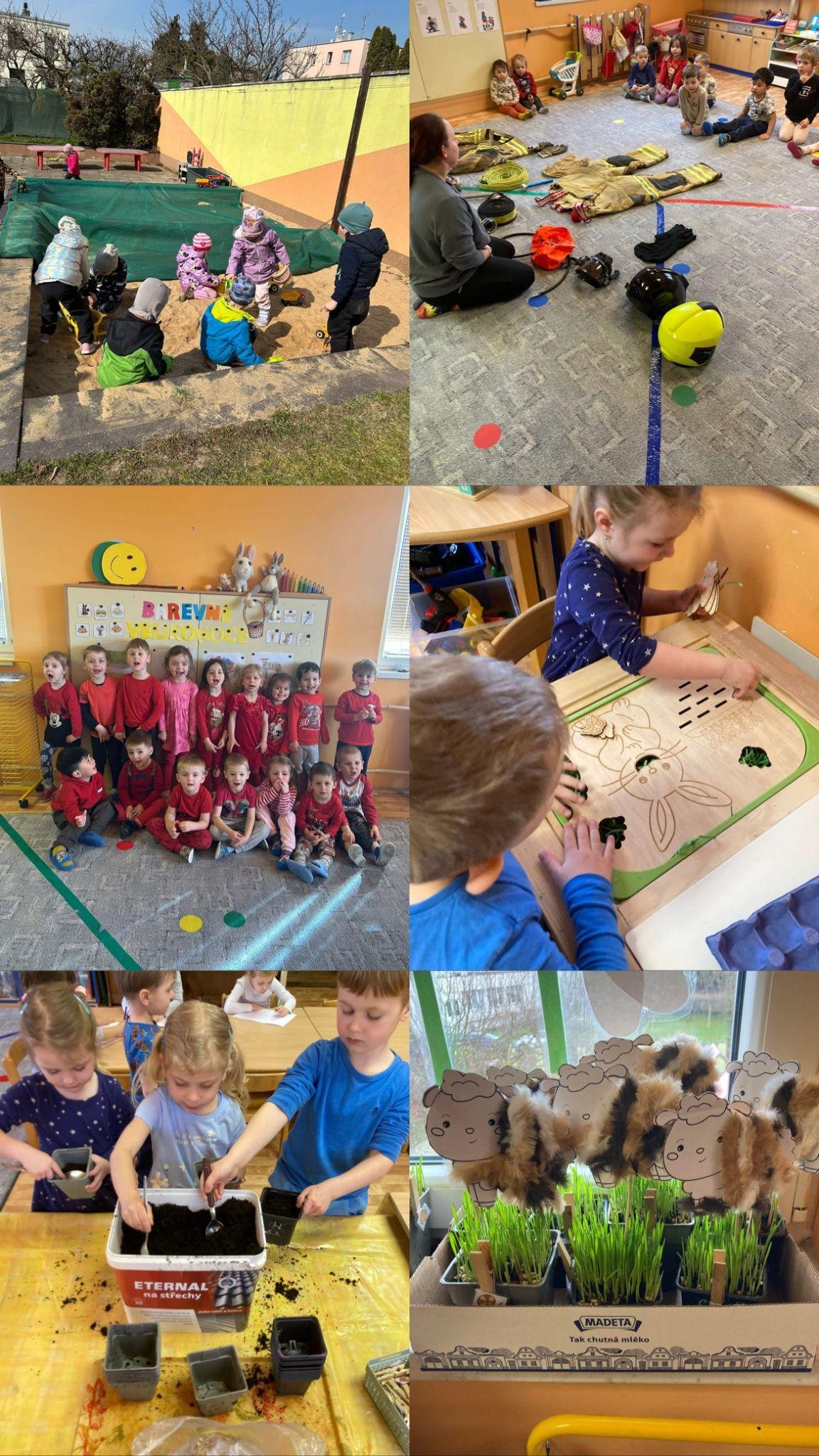 Jaro u nás začalo opravdu pestrým programem. Nejprve jsme se věnovali tématu povolání. Děti hrály oblíbenou hru „Hádej, kdo jsem a co dělám“, při které se seznamovaly s různými profesemi a zkoušely je poznávat i napodobovat. Velkým zážitkem pro nás byla návštěva dobrovolných hasičů. Ti nám ukázali své vybavení, vysvětlili, k čemu slouží, děti si mohly vše zblízka prohlédnout a vyzkoušet.